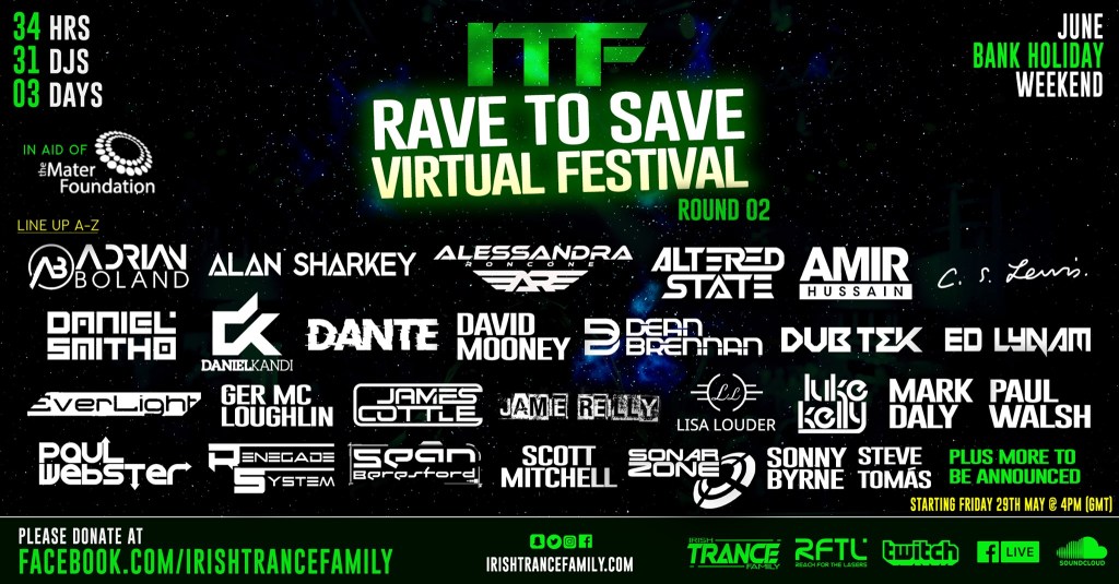 RAVE TO SAVE VIRTUAL FESTIVAL Round 02 in aid of The Mater Foundation & support frontline staff in the fight against Covid-19.