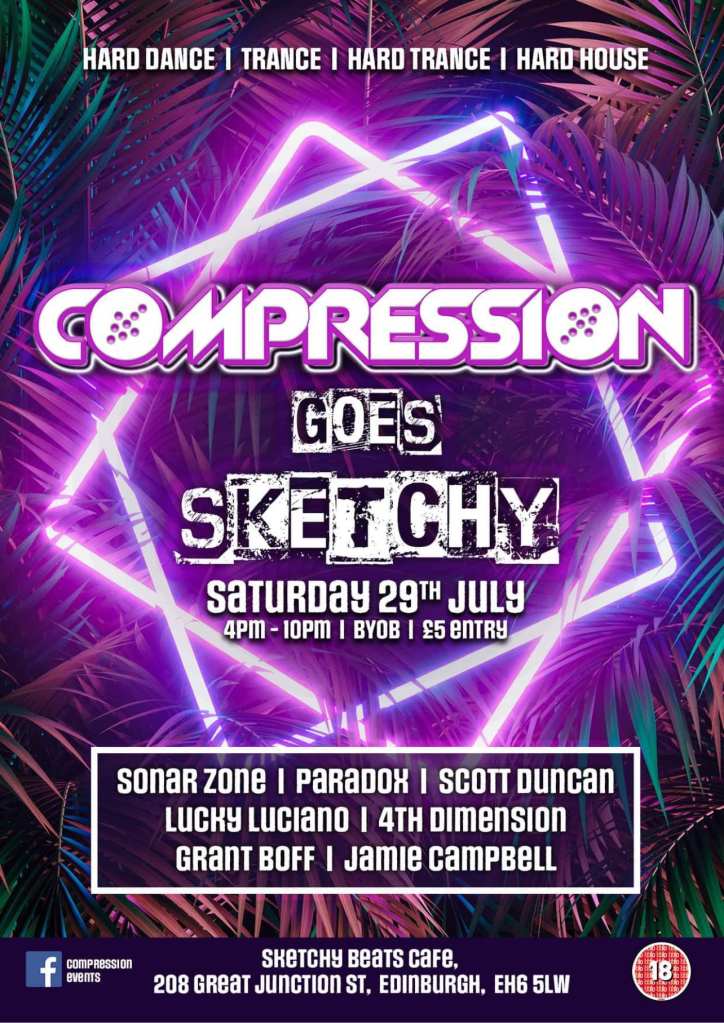 Get ready to witness an electrifying fusion of hard-hitting beats and mind-bending melodies as “Compression Goes Sketchy” takes over Sketchy Beats Cafe in Edinburgh! Prepare yourself for an unforgettable evening of hard dance, trance, hard trance, and hard house that will keep you moving from 4pm until 10pm on Saturday, 29th July.