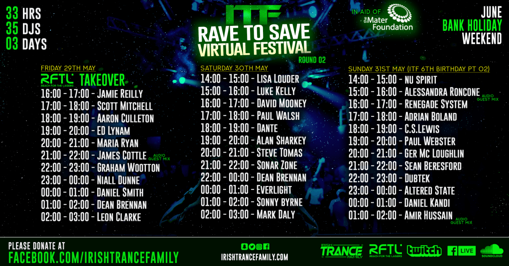 June Bank Holiday weekend ITF pres. RAVE TO SAVE VIRTUAL FESTIVAL Round 02 in aid of The Mater Foundation & support frontline staff in the fight against Covid-19.
