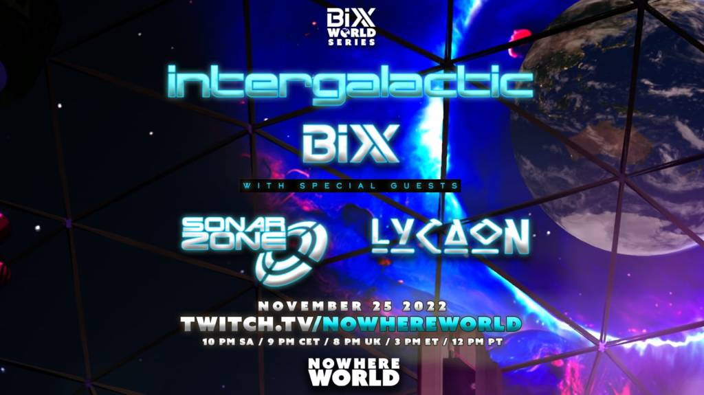 Bixx World returns with episode 5, Intergalactic. This extraterrestrial event features Bixx with special guest Sonar Zone and DJ Lycaon, Join us Friday November 25th 2022 at twitch.tv/nowhereworld.