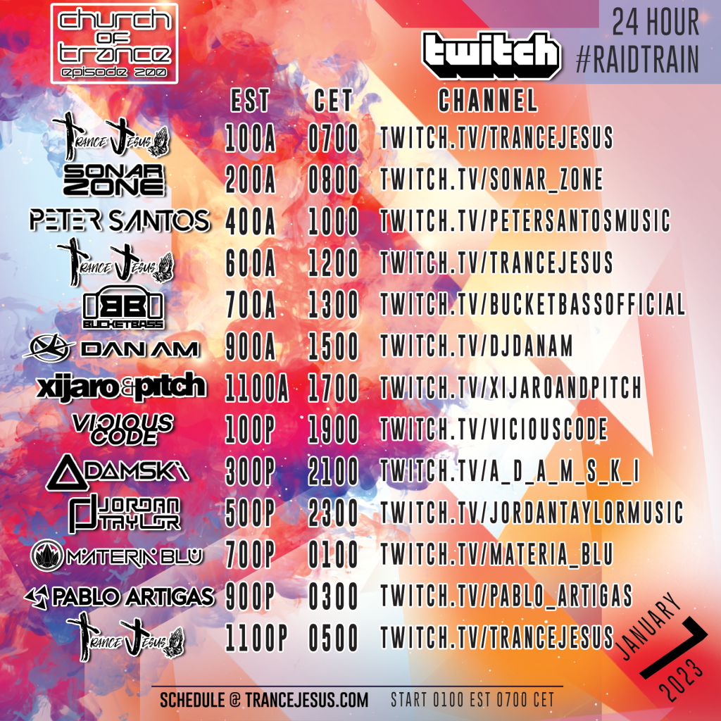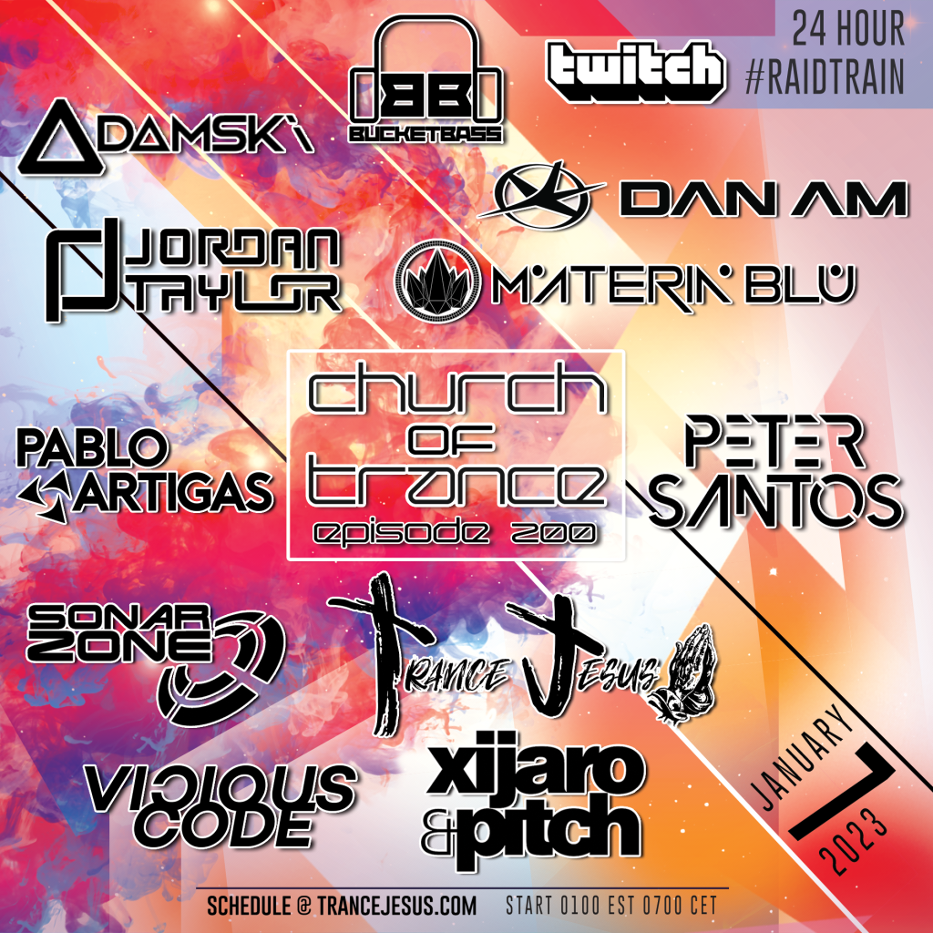 Since then, #trancejesus has taken to Twitch in 200 episodes of his #churchoftrance livestream, and this Saturday, January 7 I’m excited to be a part of a 24 hour #raidtrain celebration alongside some amazing fellow streamers.