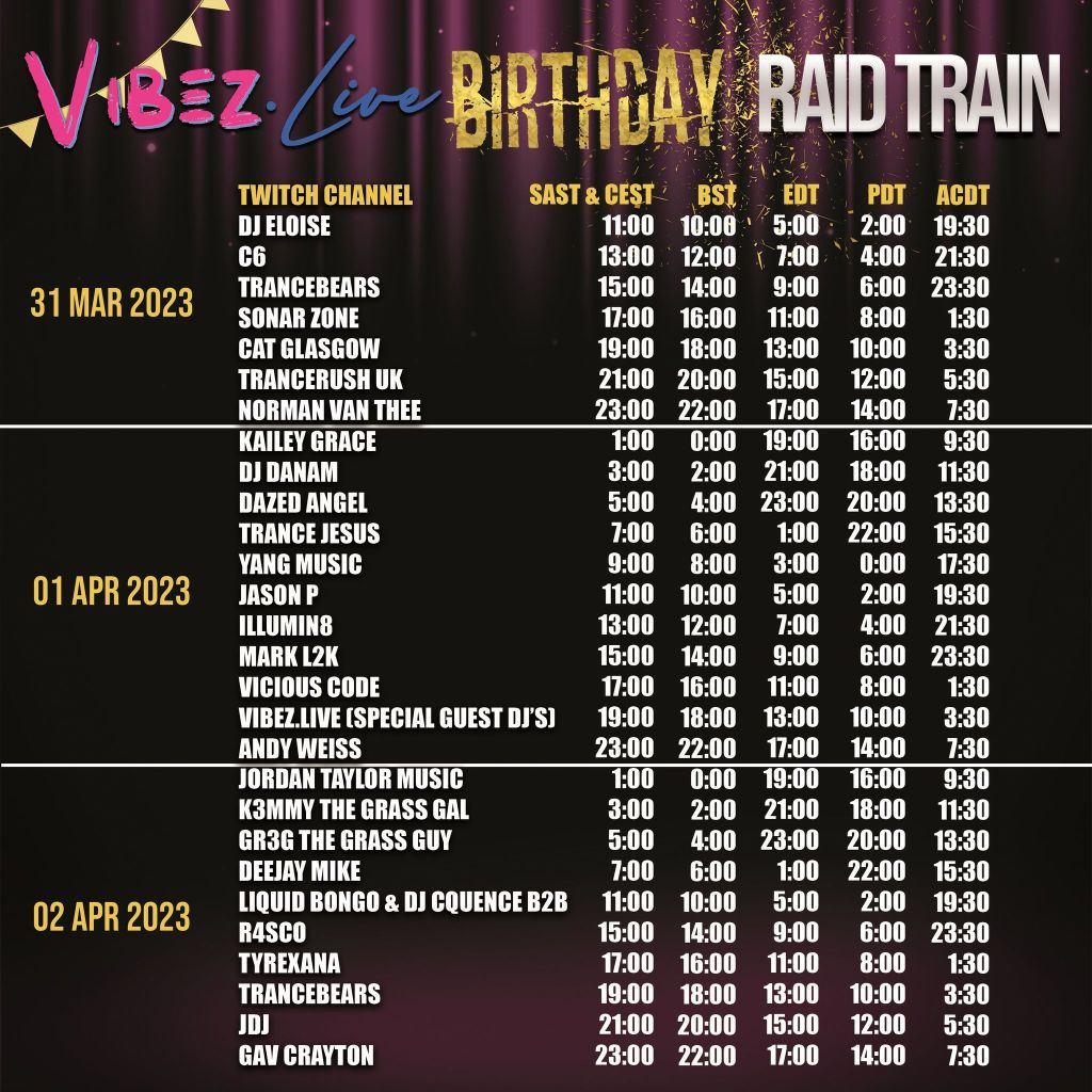 To celebrate these incredible milestones, we invite you to join us on our very first Twitch Raid Train! This is going to be one wild ride that you won’t want to miss. We’ve got an incredible lineup of DJs from around the world who will be bringing you the very best in trance music. From classic tracks to the latest releases, we’ve got it all. The Twitch Raid Train will kick off on March 31st and will run through April 2nd. It’s going to be a non-stop party, with DJs playing back-to-back sets, and the energy never letting up. We’ll be raiding each other’s channels, so you never know where the party will take you next. It’s the perfect opportunity to meet new people, discover new music, and connect with our amazing community.
